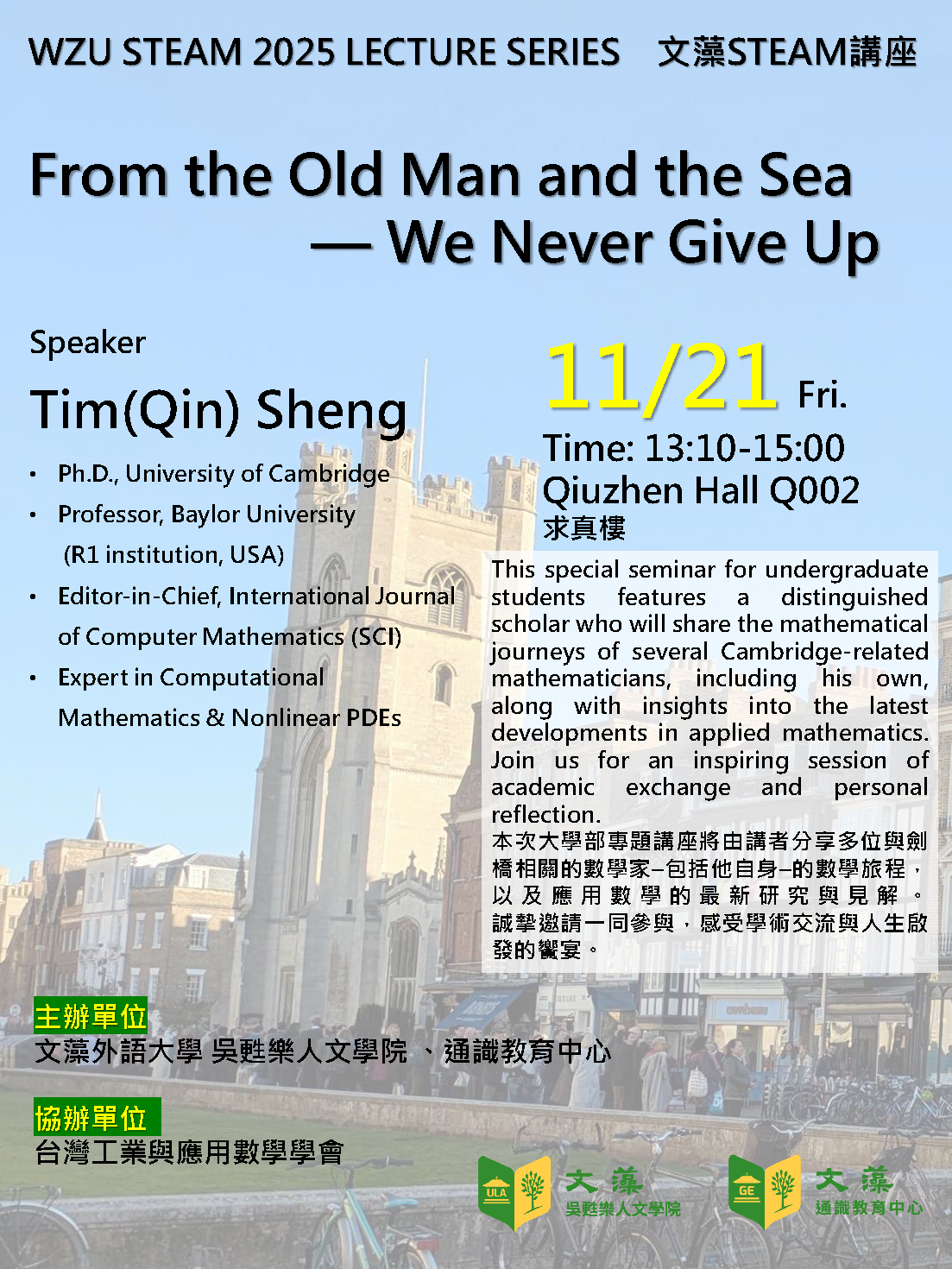 本次大學部專題講座邀請重量級學者分享多位與劍橋相關的數學家——包括他自身——的數學旅程,並探討應用數學的最新發展與洞見。