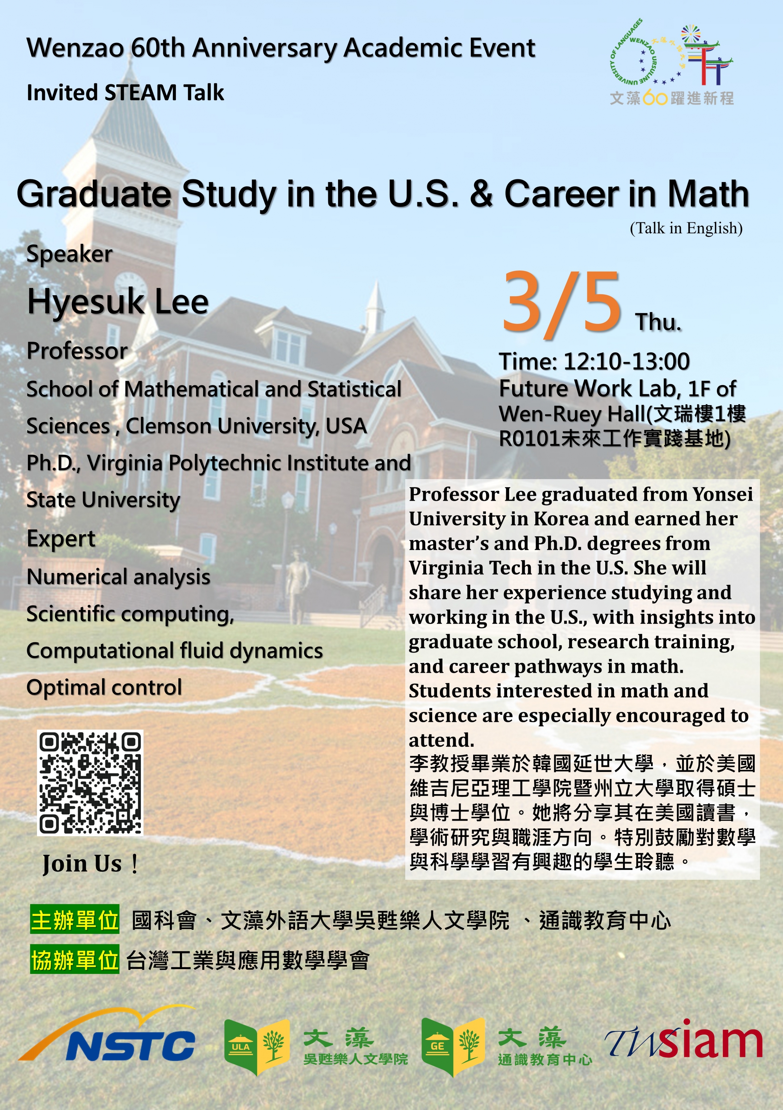 Wenzao 60th Anniversary Academic Event STEAM Interdisciplinary Learning and Career Lecture — Prof. Hyesuk Lee, Clemson University (Mar. 5, 2026) The Ursuline College of Liberal Arts is honored to invite Prof. Hyesuk Lee from Clemson University for a special student lecture on Mar. 5. Topic:Graduate Study in the U.S. and Career Development in Mathematics. Prof. Lee, an alumna of Yonsei University and Virginia Tech, will share her experiences regarding American education, academic research, and career paths. Students interested in math and science are highly encouraged to join! 【Lecture Info】 Speaker: Prof. Hyesuk Lee Affiliation: School of Mathematical and Statistical Sciences, Clemson University, USA Time: Thursday, Mar. 5, 2026 | 12:10 – 13:00 (Lunch provided) Venue: Future Work Lab, 1F of Wen Ruey Hall Language: English Registration: https://reurl.cc/VmKbpR Deadline: Tue., Mar. 3, 2026, 17:00 |